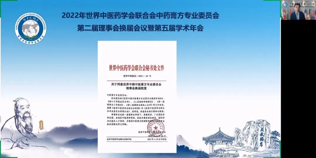 2022年12月4日上午,世界中醫(yī)藥學會聯(lián)合會(世界中聯(lián))中醫(yī)膏方專業(yè)委員會第二屆理事會換屆會議暨第五屆學術年會通過線上方式隆重召開。世界中聯(lián)主席馬建中向大會發(fā)來視頻致辭,學術部主任焦云洞代表世界中聯(lián)參加大會,全國政協(xié)委員、首都名中醫(yī)、享受國務院政府特殊津貼專家、世界中聯(lián)中醫(yī)膏方專業(yè)委員會會長、北京康益德中西醫(yī)結合肺科醫(yī)院董事長兼院長董瑞和顧問、副會長、常務理事、理事及會員共335人參加了大會。其中來自匈牙利、葡萄牙、澳大利亞、俄羅斯、瑞典、波蘭、英國、美國、芬蘭、韓國、中國香港、中國澳門、中國臺灣等地的外籍專家學者65人。會議由第一屆理事會秘書長秦洪義教授主持。