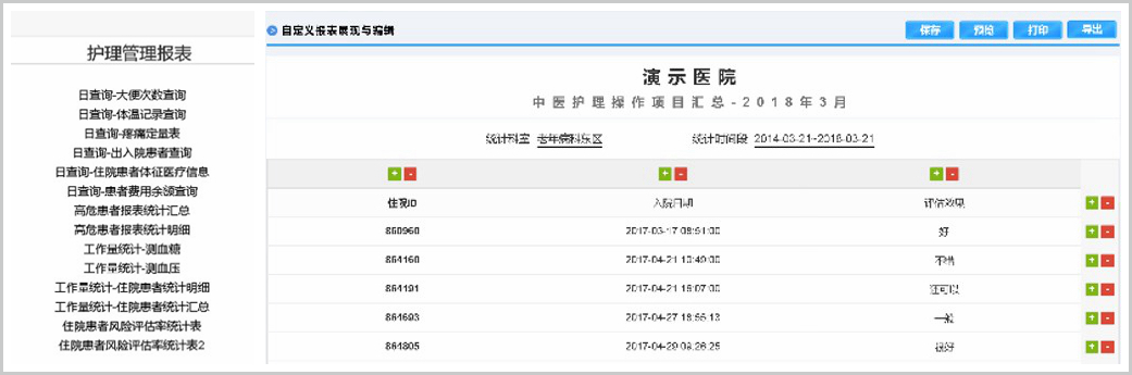 系統(tǒng)內(nèi)置具有高度可配置性的自定義報表功能,不僅支持查詢分析類報表更加可以實現(xiàn)基于報表的二次錄入和實時編輯,充分滿足護理統(tǒng)計預分析的個性化需求