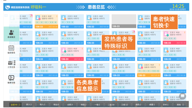 通過(guò)矩陣標(biāo)簽式患者視圖,概覽整個(gè)病區(qū)情況,并可以快速點(diǎn)選、交互查看不同類(lèi)型患者信息,通過(guò)圖形化方式展現(xiàn)患者類(lèi)型、出入院情況、基本信息、發(fā)燒情況、護(hù)理級(jí)別、病情危重程度等。