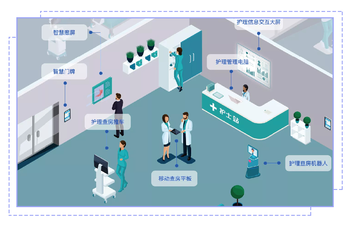 目前,根據(jù)湖南省腫瘤醫(yī)院智慧病房建設(shè)項目需求及場地條件,基于院內(nèi)智能應用場景將布局結(jié)構(gòu)劃分為:護士站、醫(yī)生辦公室、病房走廊、病房內(nèi)部,每個區(qū)域配備智能信息化設(shè)備。